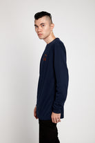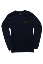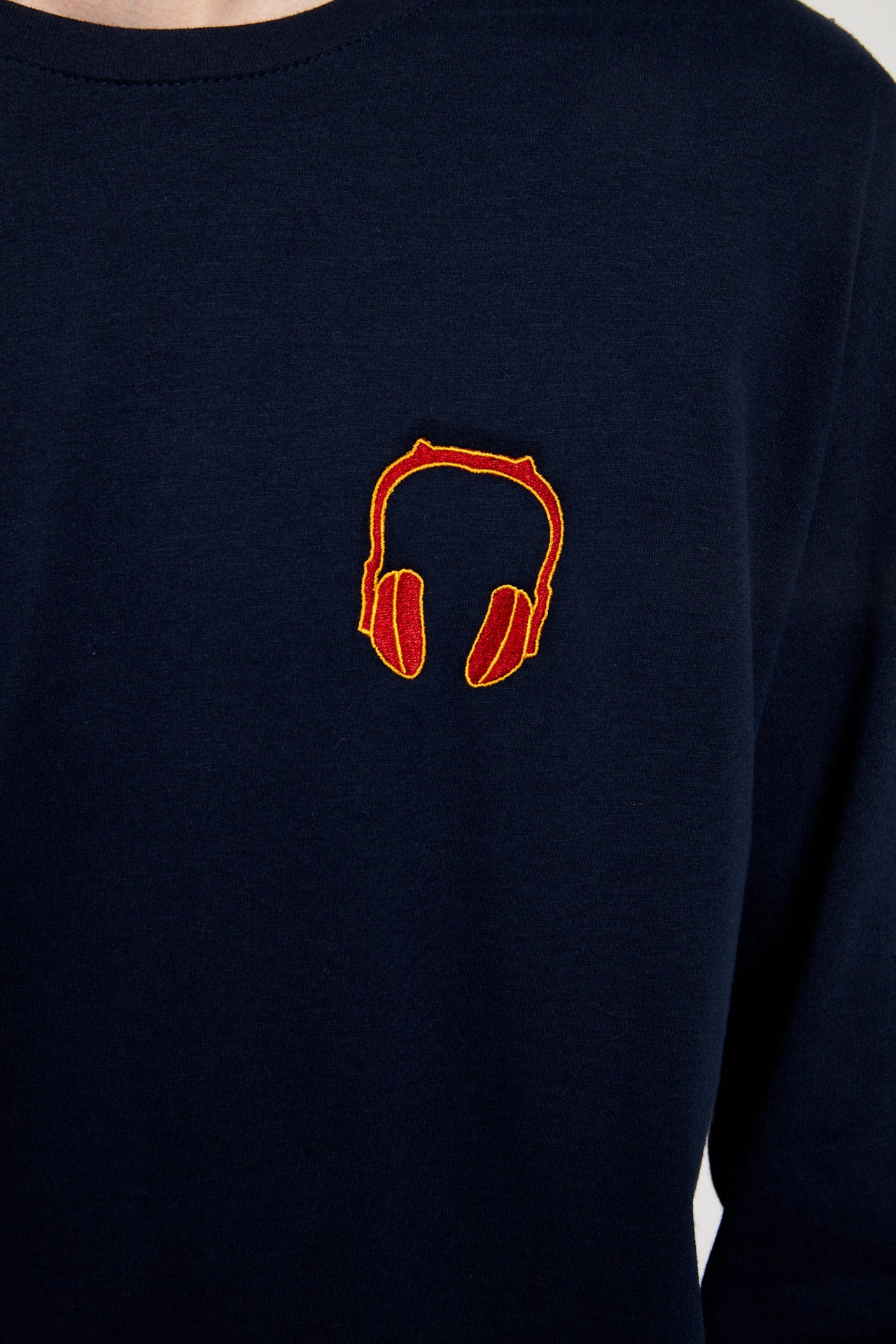 Two-color embroidered SOUNDOFF Demon Idol headphones on a super-comfortable sueded cotton, crew neck t-shirt perfect for seasonal layering or standalone casual street style. Midnight Navy.