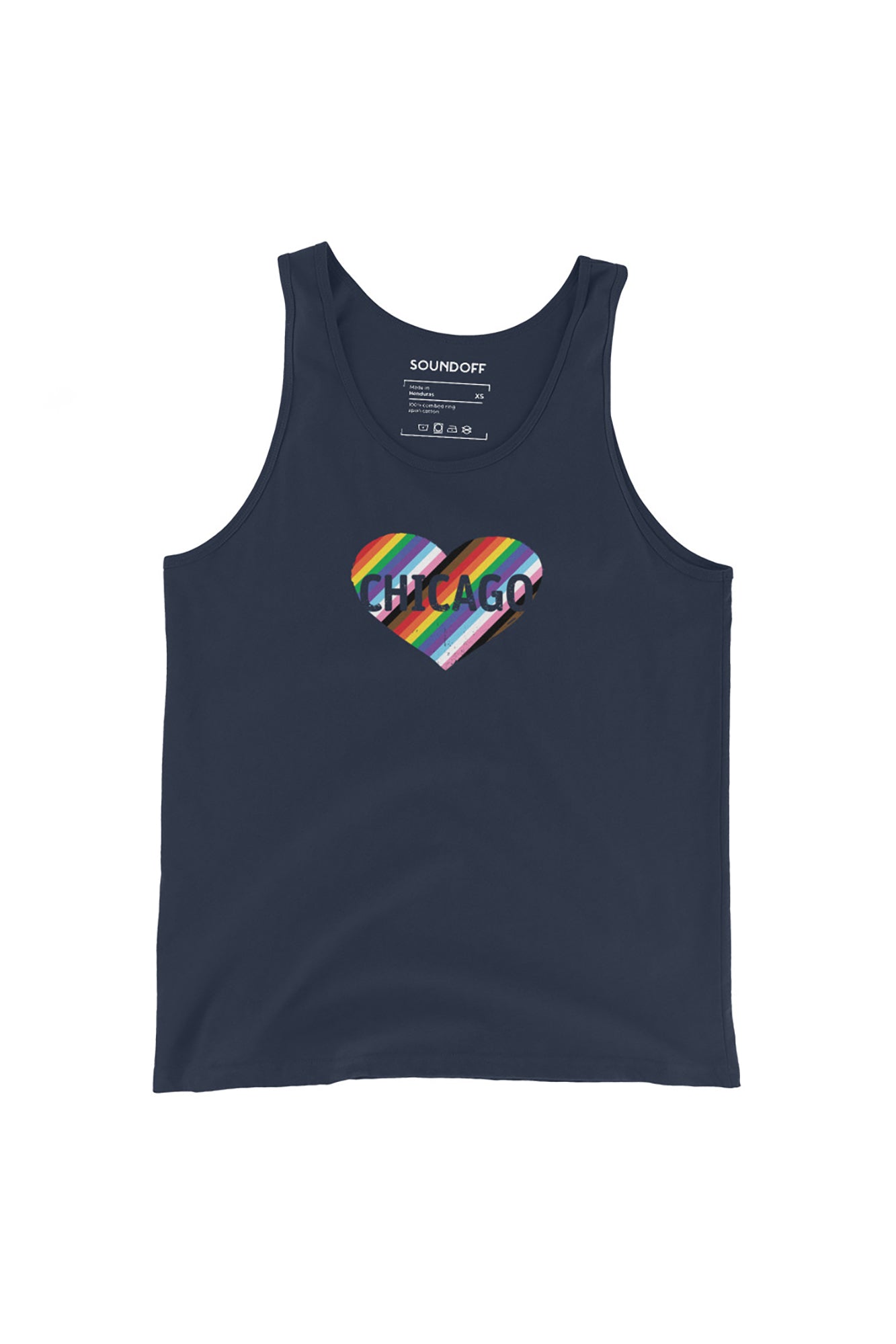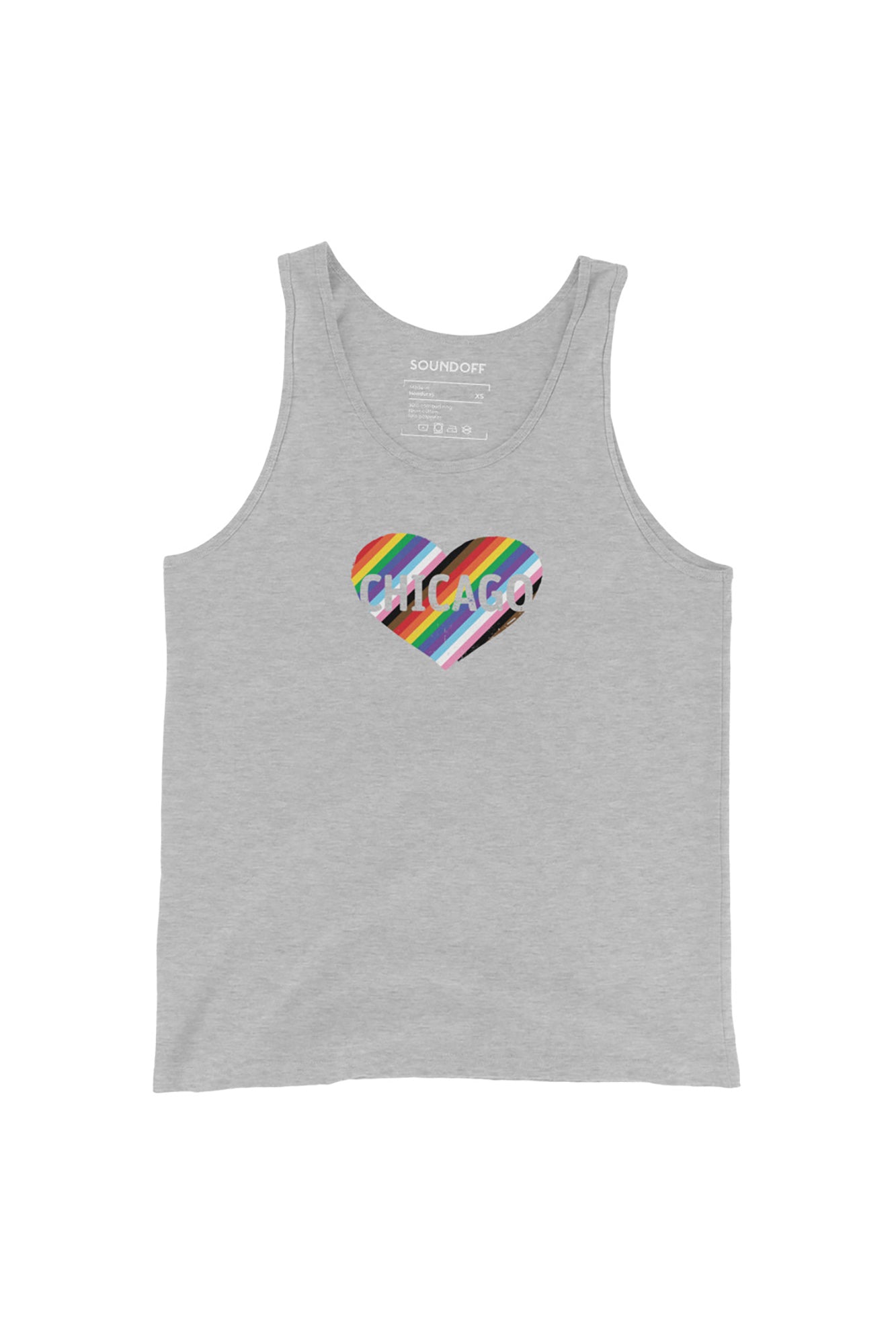 Show your city pride with the 'Heart of Chicago' tank. Featuring a vibrant rainbow heart, it's a stylish nod to the Windy City for any Chicago enthusiast.