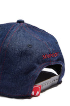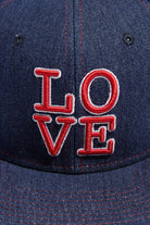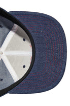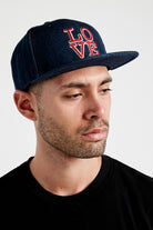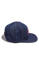 Structured 6-panel hat with flat visor and high crown in navy denim with red contrast puff embroidery.