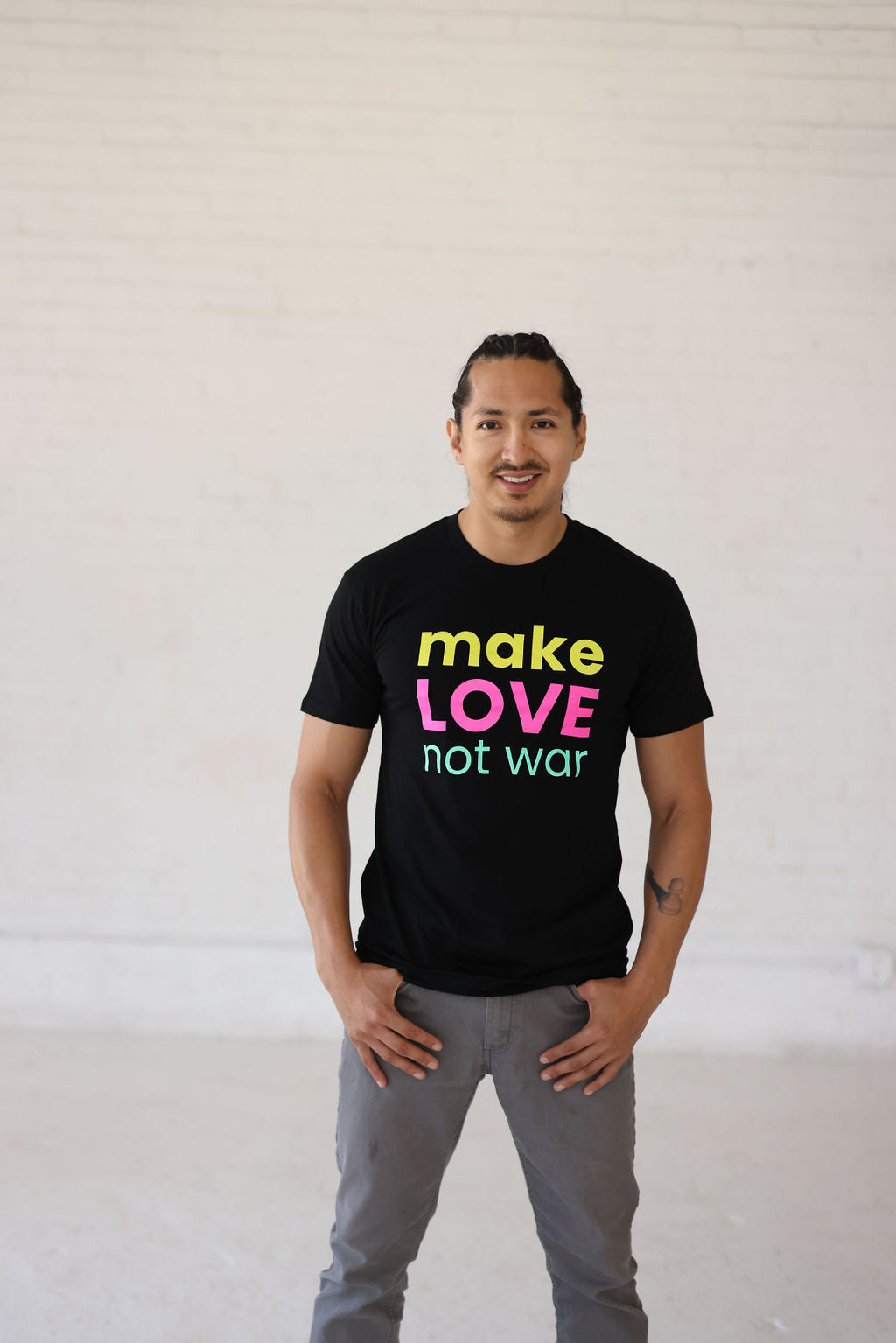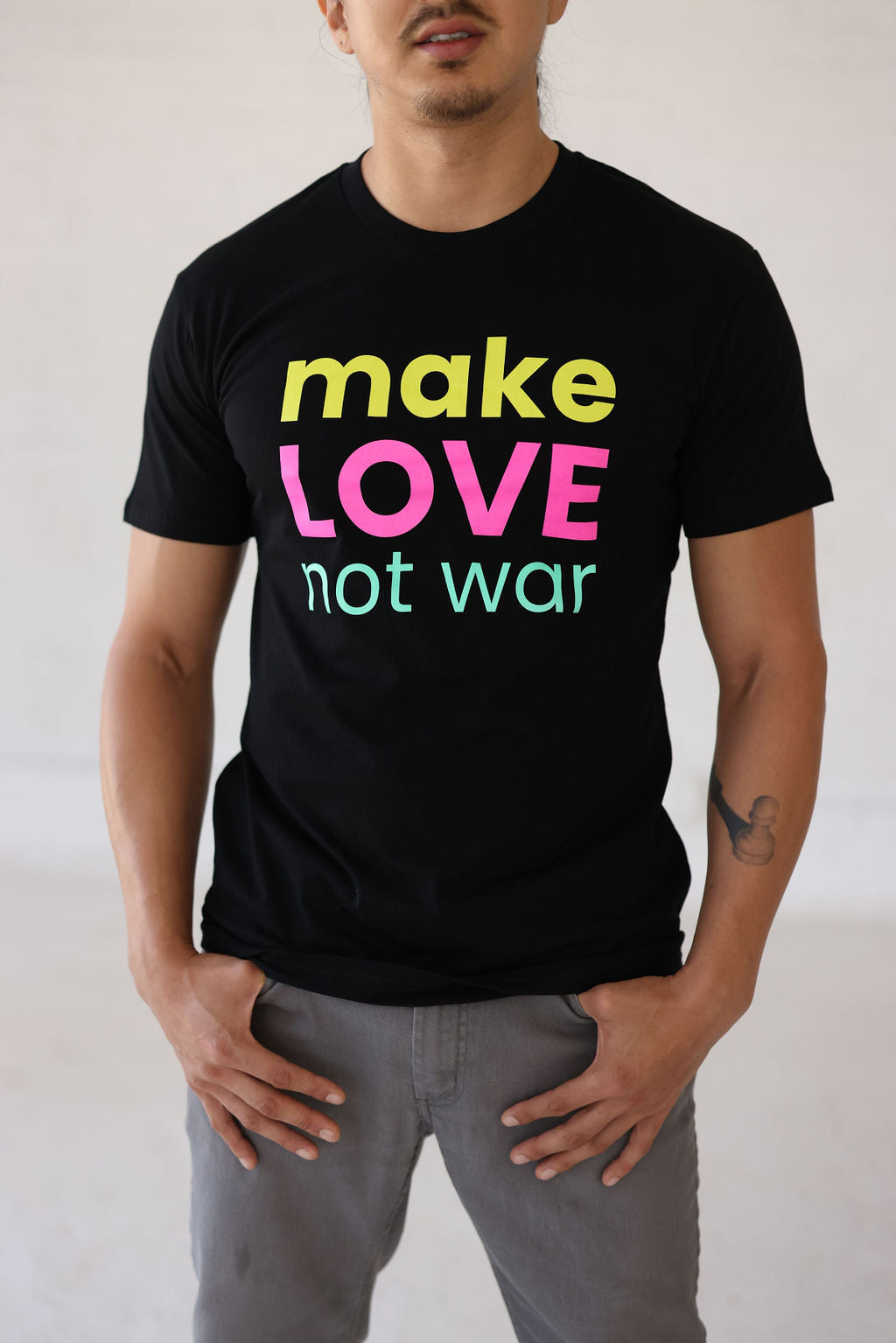 Sometimes Before You Can LOVE, You Have To Fight For The Right. Super-comfortable, premium t-shirt screenprinted with MAKE LOVE NOT WAR in 'nod to the 80's' neon colors.