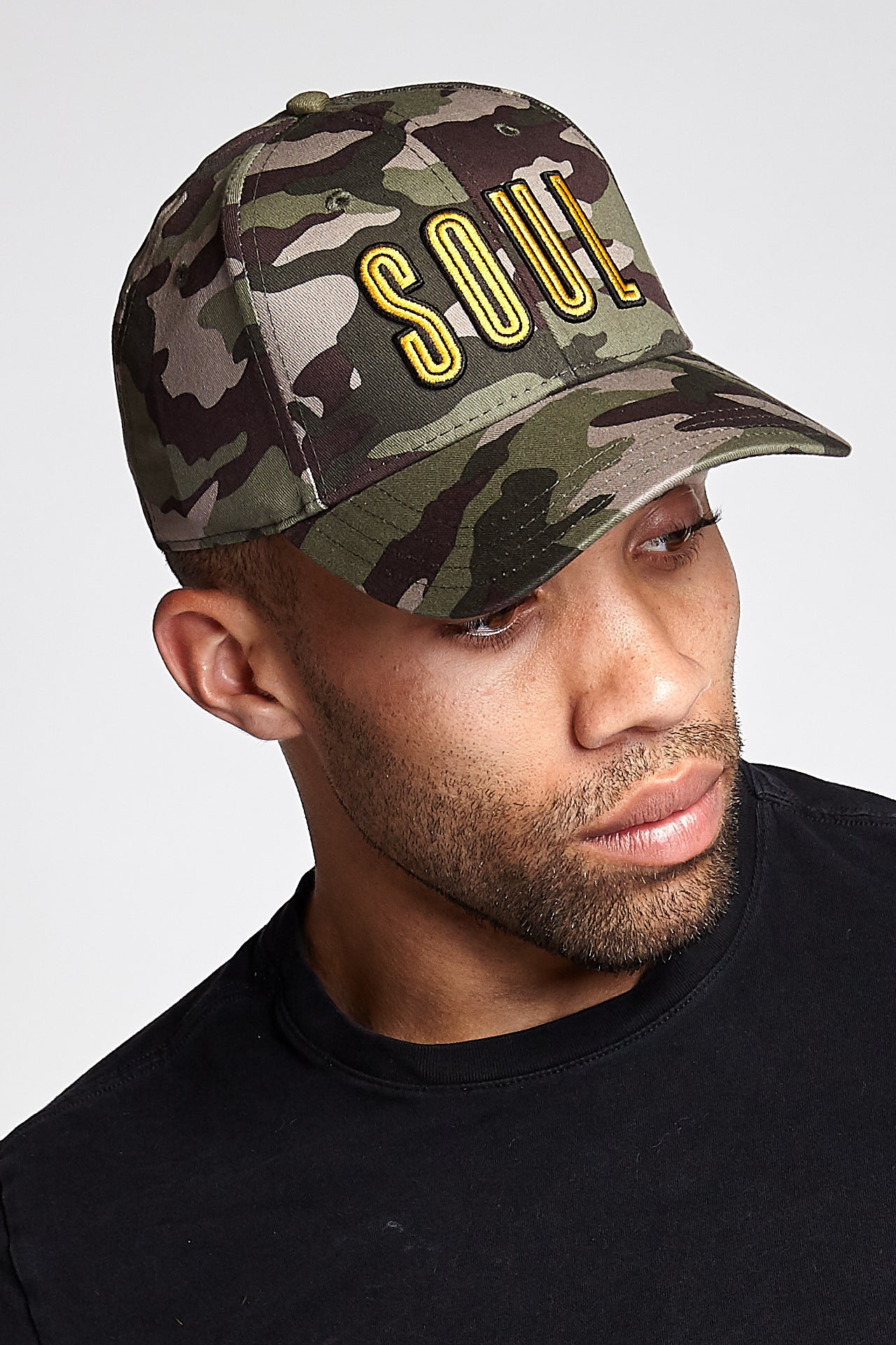 If you got it, show it. Limited-run snapback featuring double-embroidered gold and black "SOUL" on camouflage print snapback. Structured 6-panel hat with curved visor and low crown. Cotton Twill.