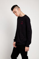 Two-color embroidered SOUNDOFF headphones on a super-comfortable sueded cotton, crew neck t-shirt perfect for seasonal layering or standalone casual street style. Black.