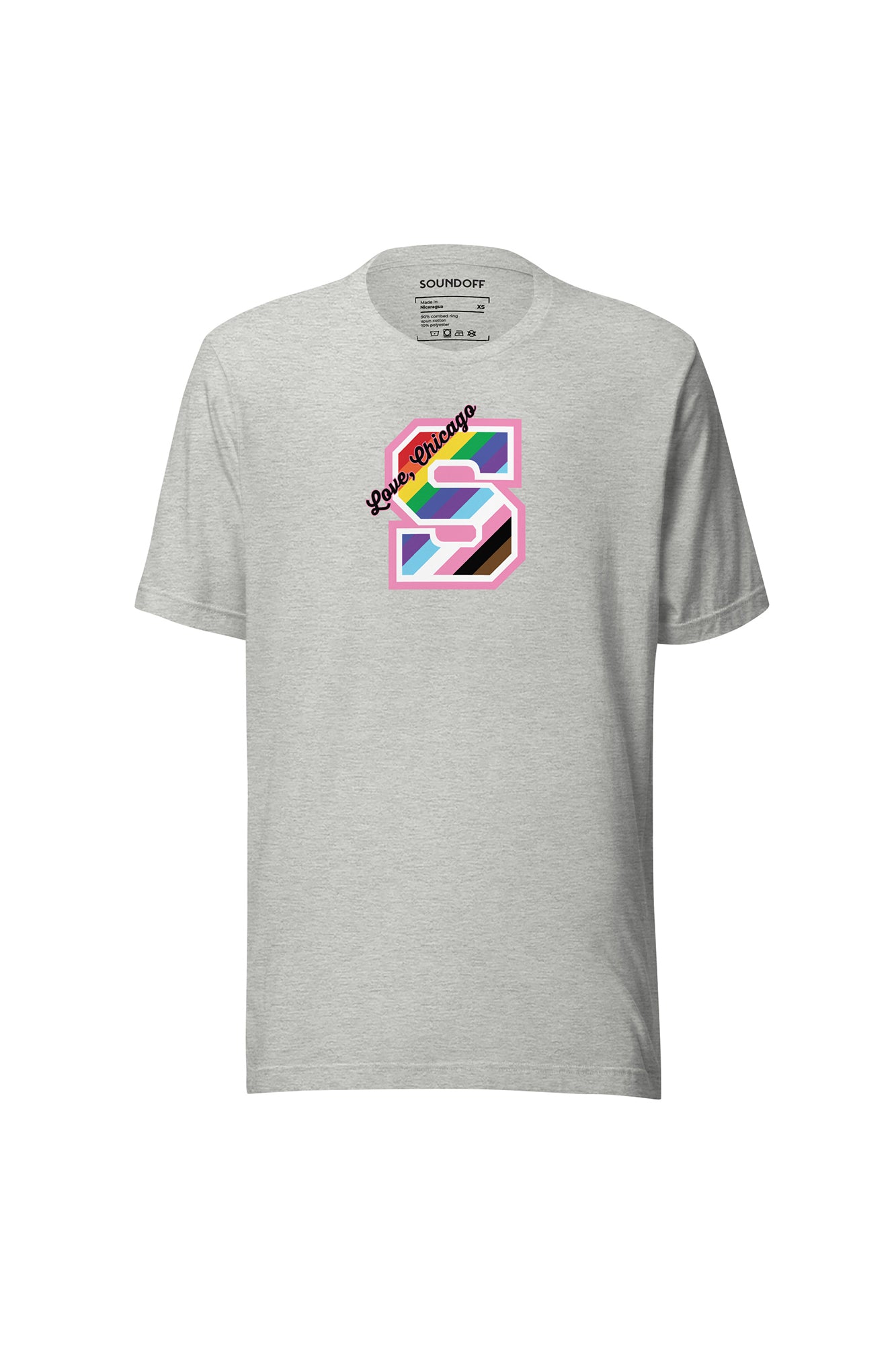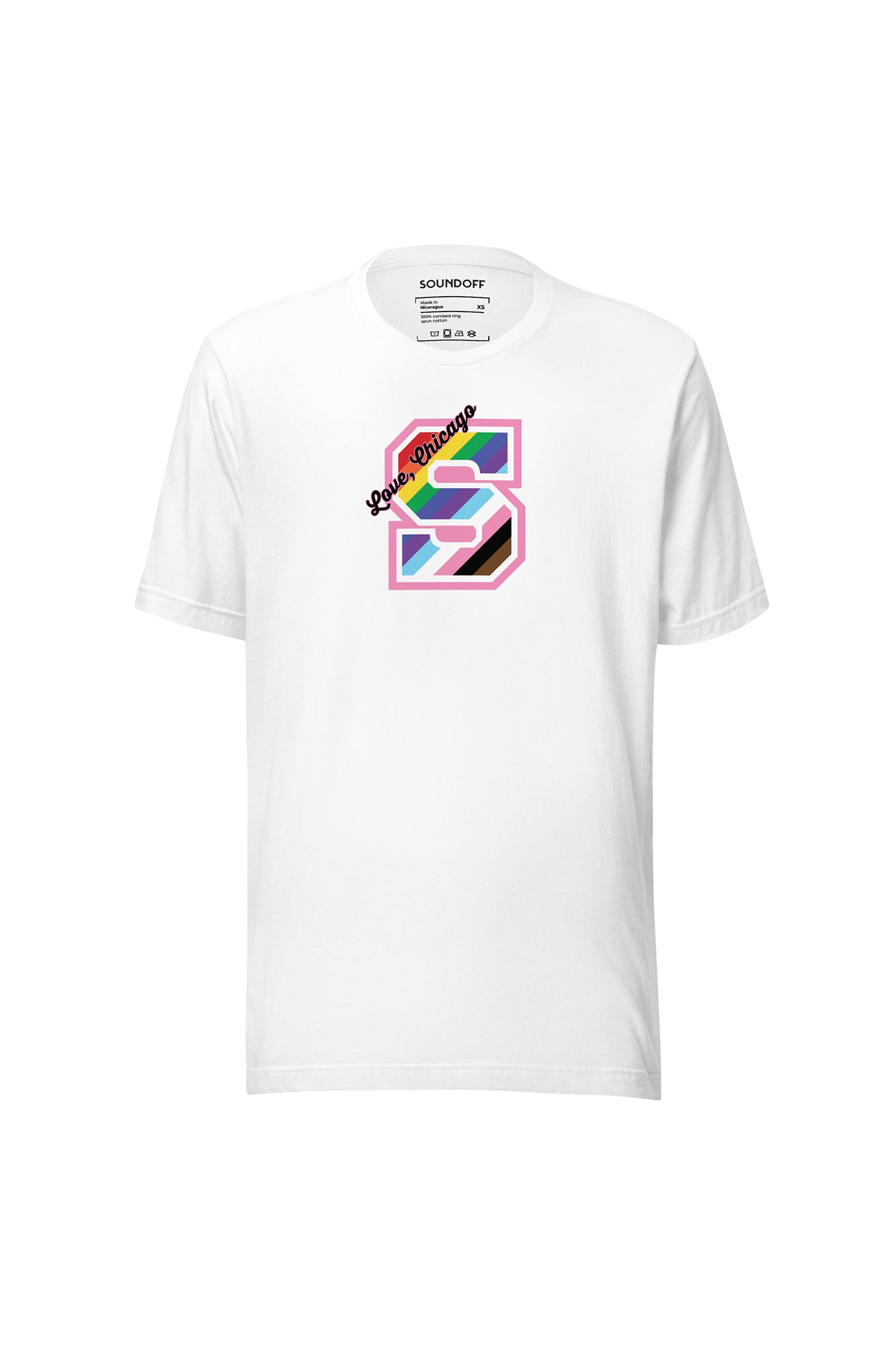 Celebrate your Chicago pride with our stylish SOUNDOFF Varsity T-shirt. Featuring a vibrant rainbow-striped 'S' and the heartfelt message "Love, Chicago," this design embodies the city's spirit and diversity. Show your love and let your style speak volumes🌈🏙️.