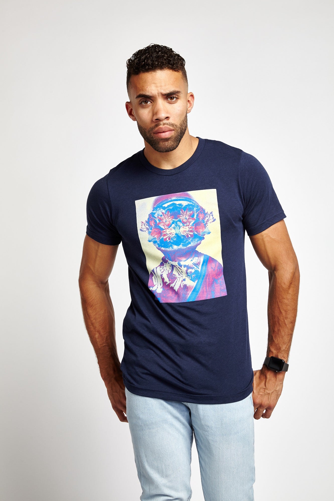 If cannabis is a pathway to divine visions, this design represents being in the grip of those visions, experiencing a flood of inspirations and higher thoughts. Multi-screen design on a super-soft triblend of cotton, poly and rayon.