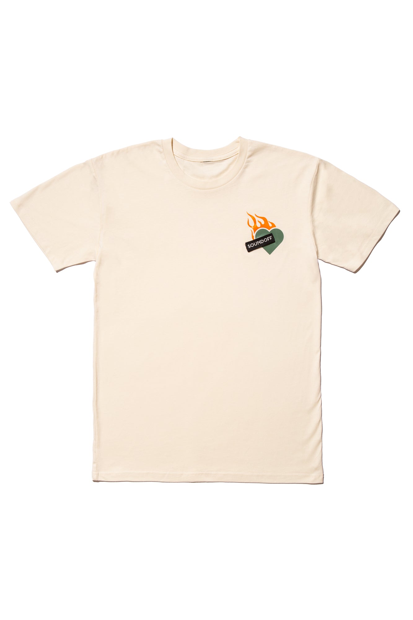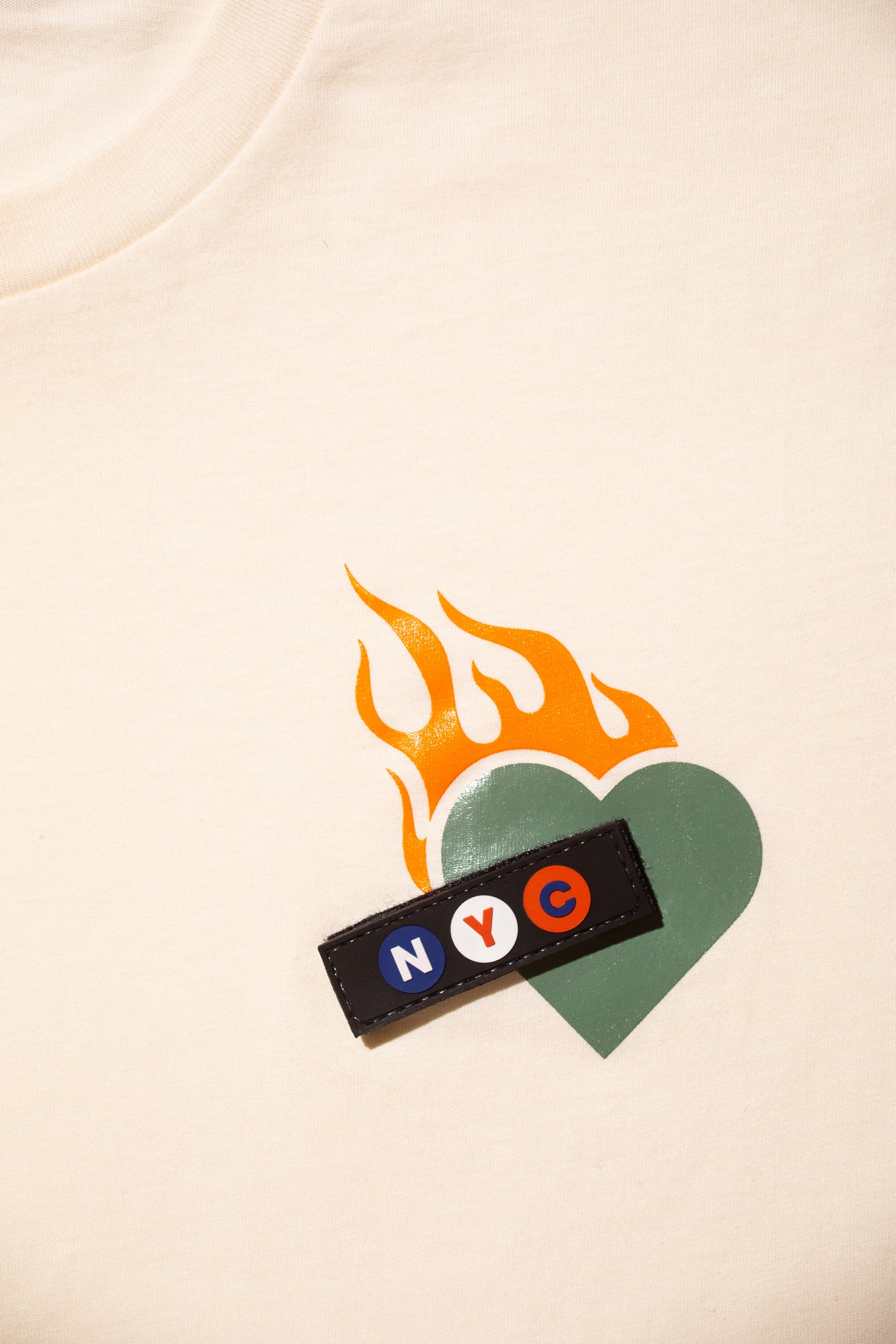 HEART ON FIRE ID PATCH CREW T-SHIRT; ECRU