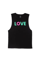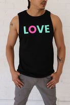 All We Need Is LOVE. Super-comfortable sleeveless t-shirt screenprinted with LOVE in 'nod to the 80's' neon colors and celebrating the tremendous gaps we have closed in the never ending pursuit for life, liberty, happiness, and, oh yeah, that thing called love.