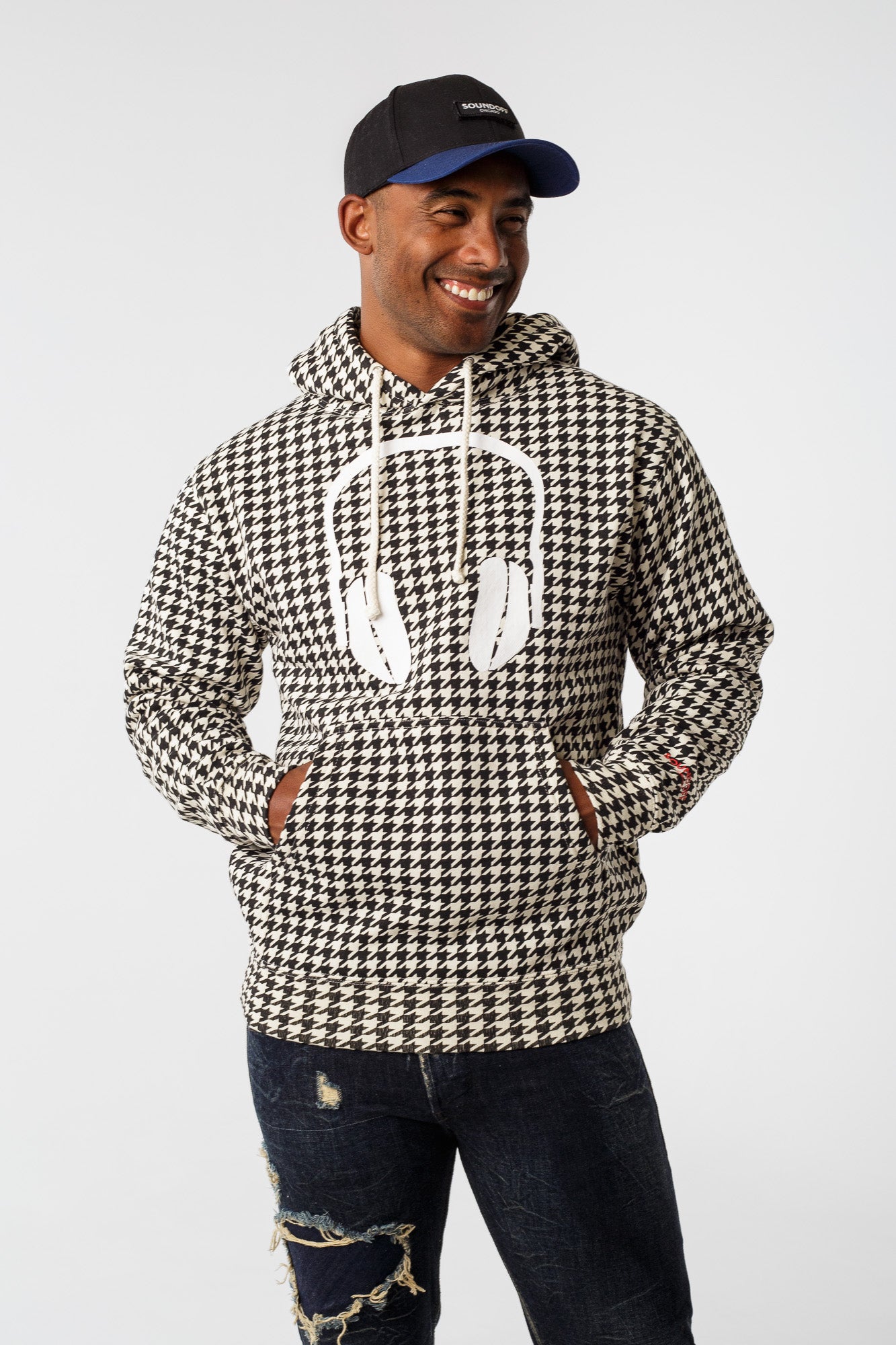 Houndstooth & Headphones. Vibe. Sartorial meets street in this SPECIAL EDITION Houndstooth Print Heavyweight Hoodie imprinted with our SOUNDOFF Headphones. Very limited run.