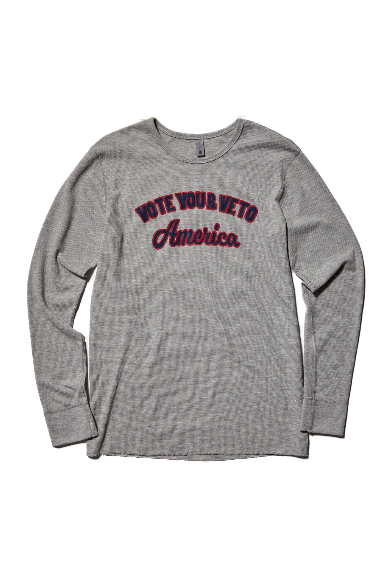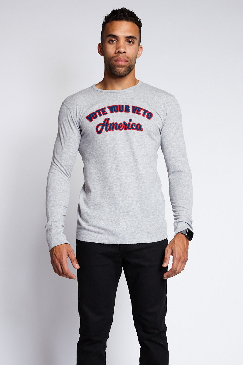 Two-color screen on a super-comfortable waffle thermal. Perfect for the fall voting season.