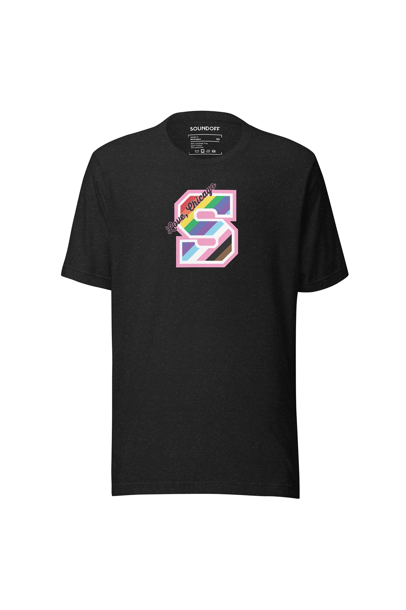 Celebrate your Chicago pride with our stylish SOUNDOFF Varsity T-shirt. Featuring a vibrant rainbow-striped 'S' and the heartfelt message "Love, Chicago," this design embodies the city's spirit and diversity. Show your love and let your style speak volumes🌈🏙️.