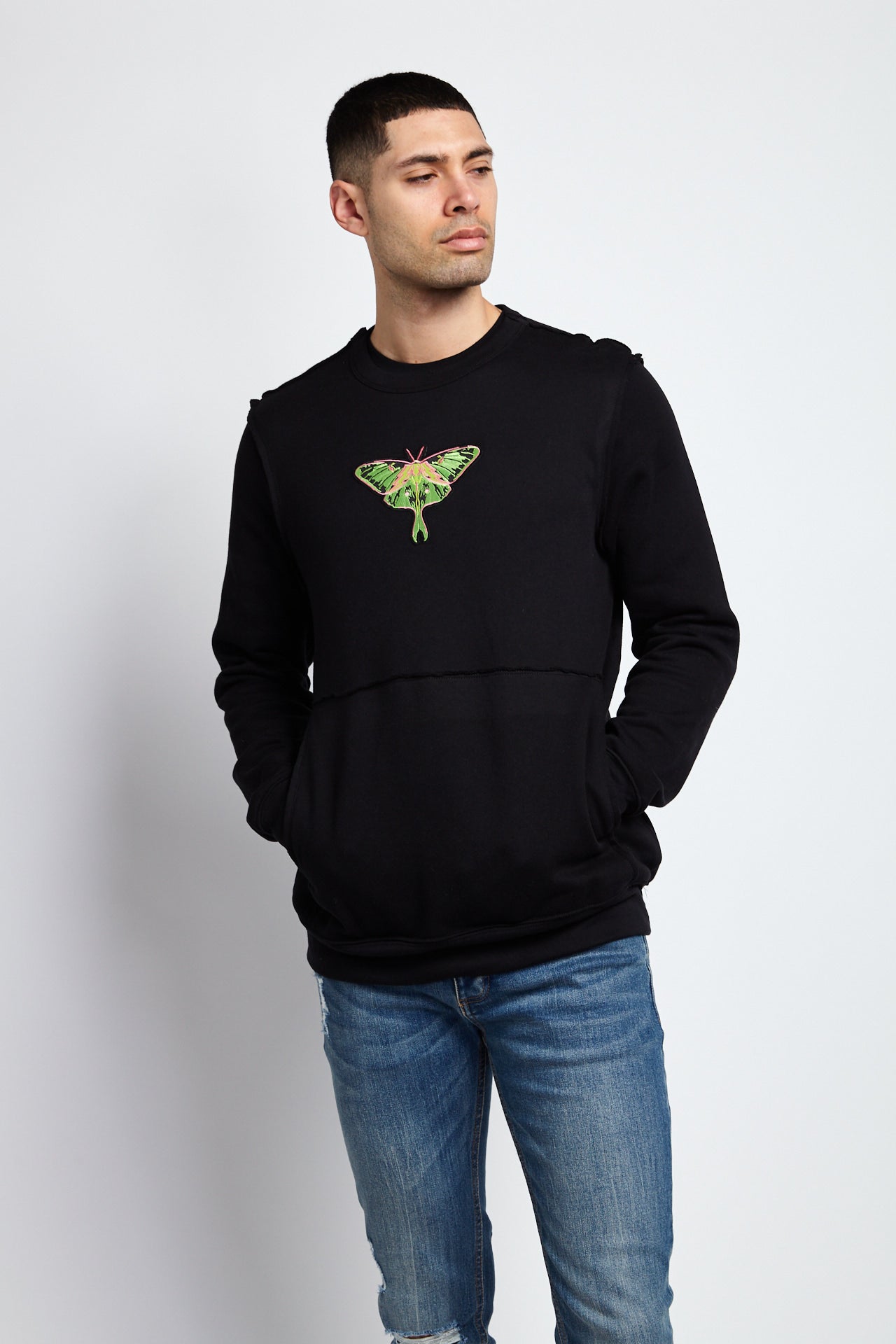A MOTH TO A FLAME RAW SEAM SWEATSHIRT; BLACK