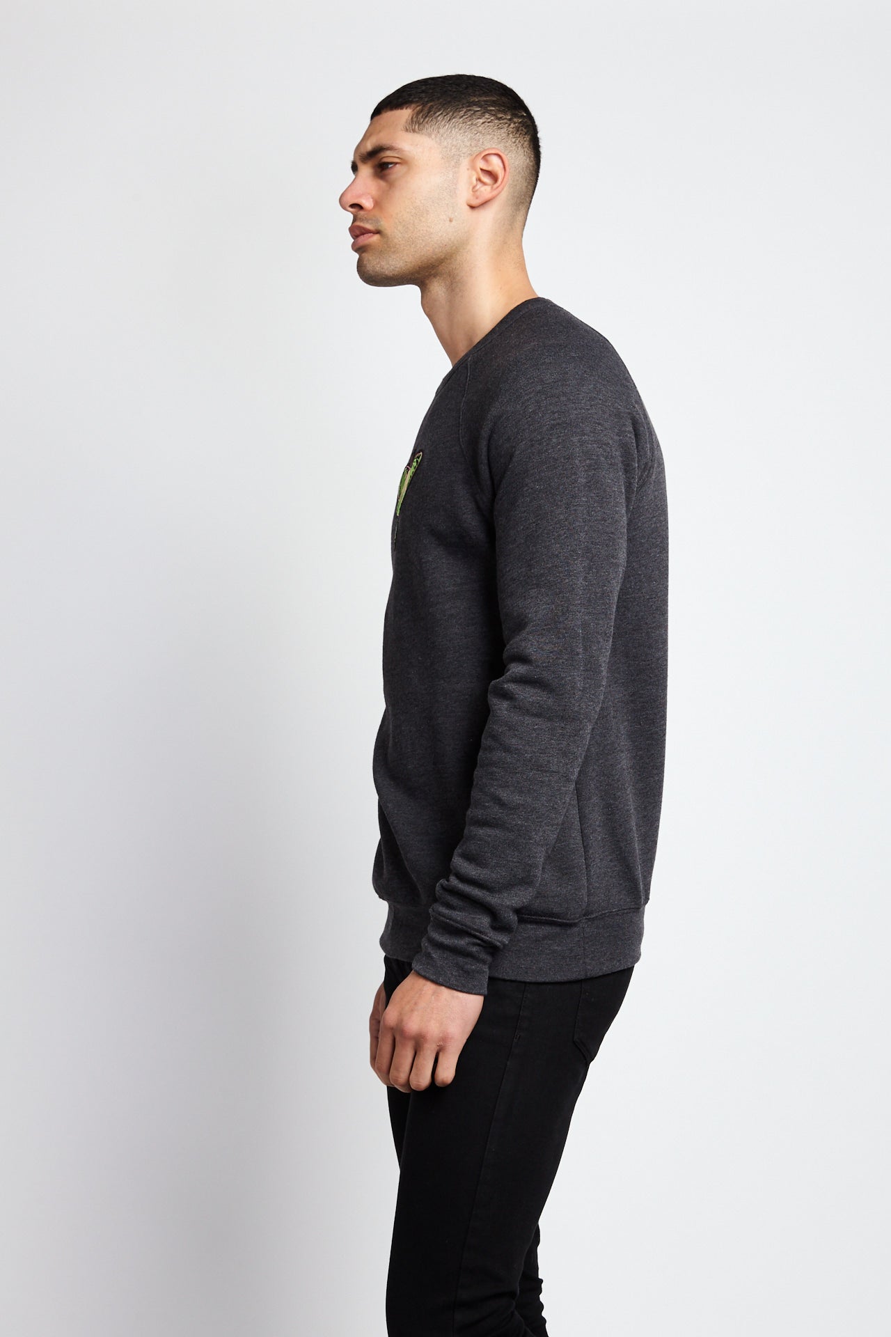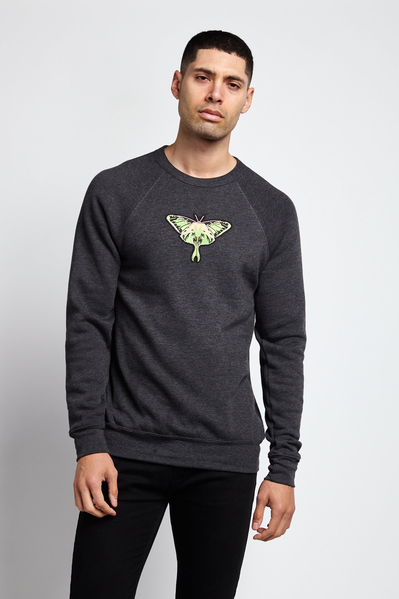 A MOTH TO A FLAME CREW SWEATSHIRT; DARK GRAY HEATHER