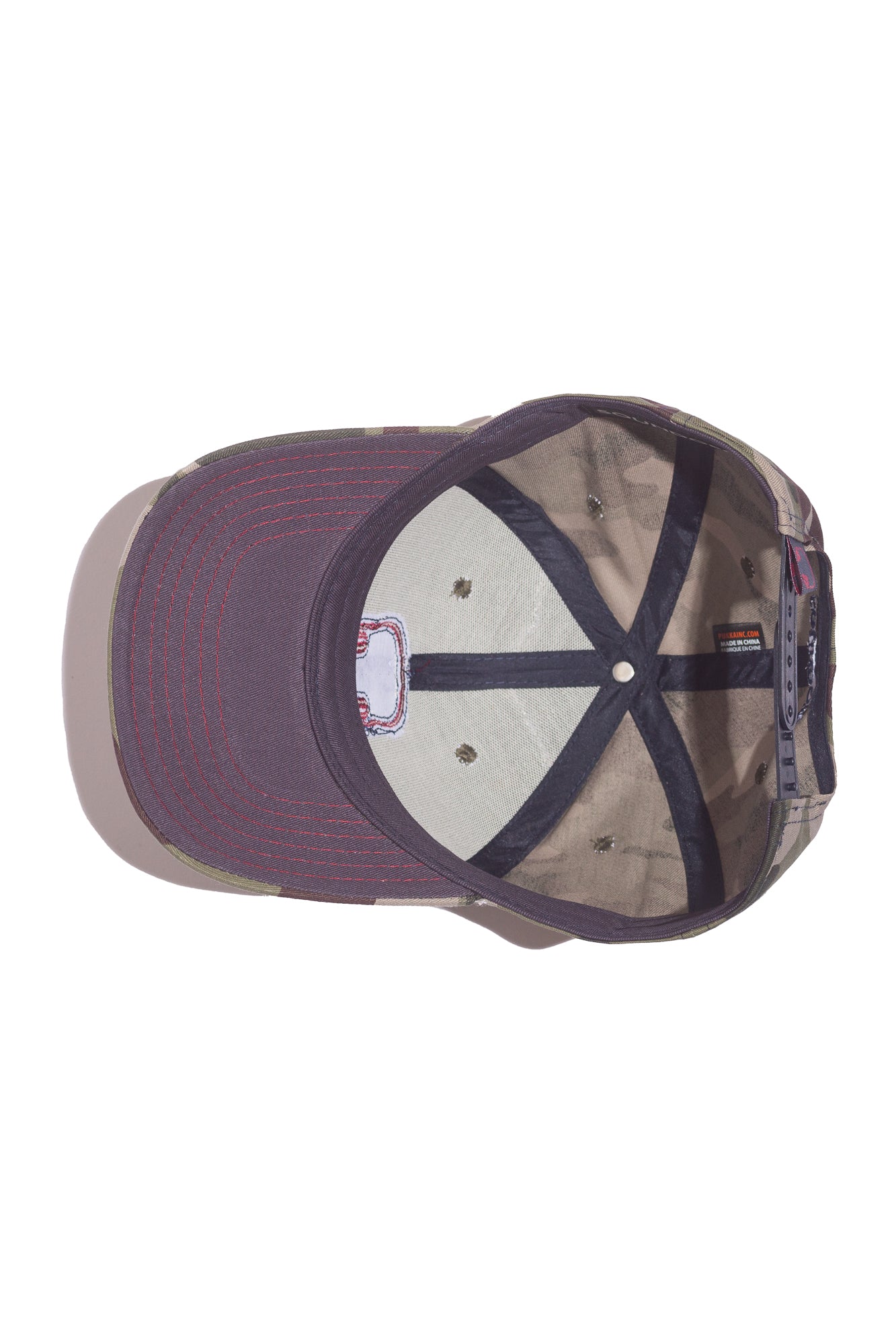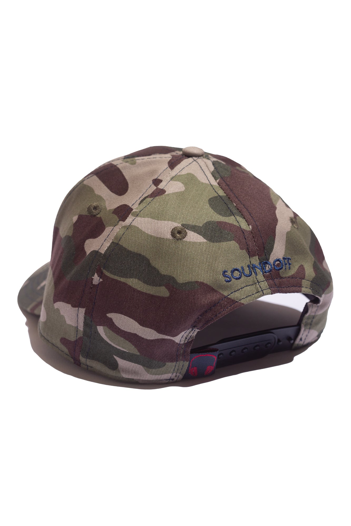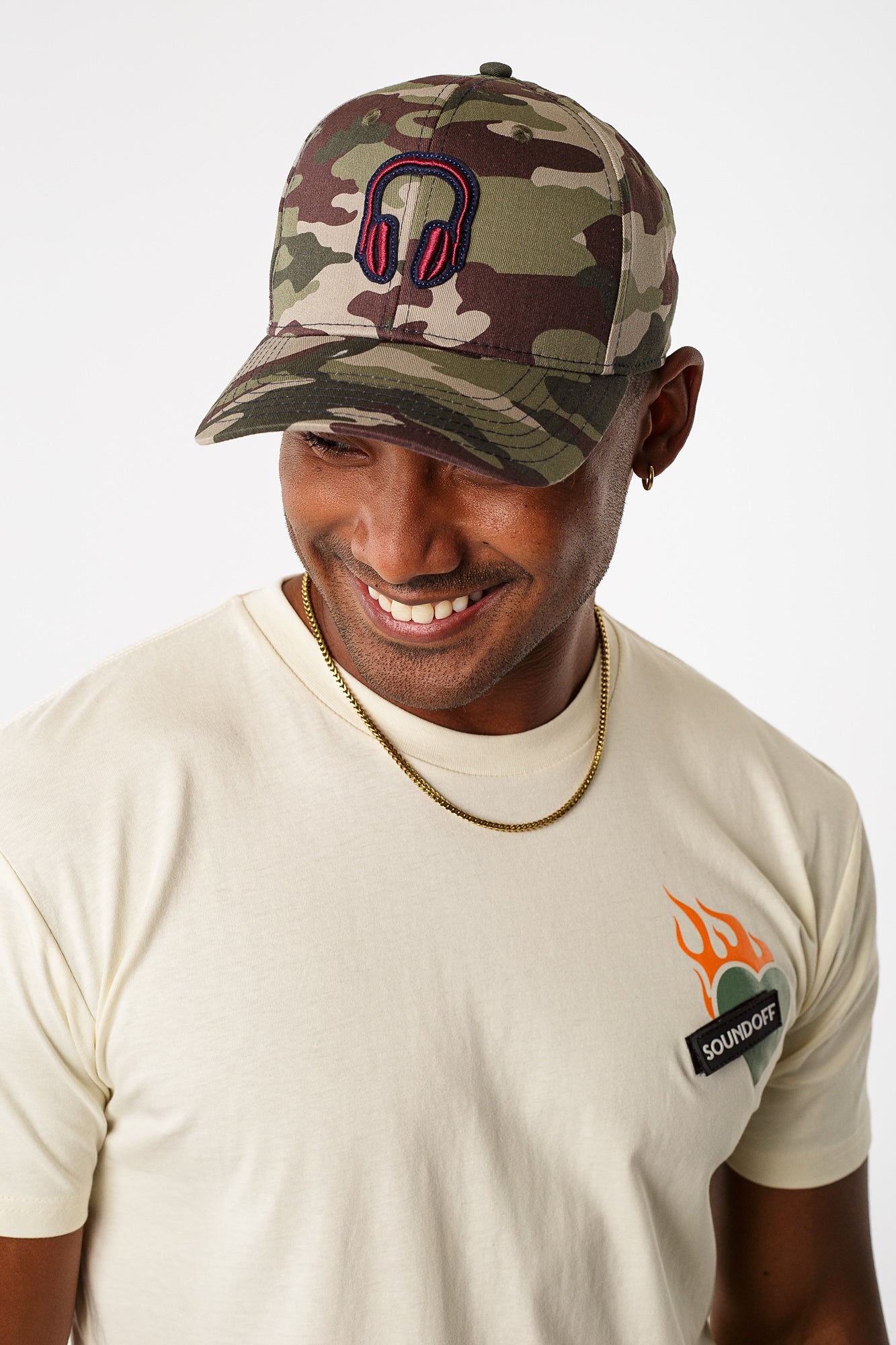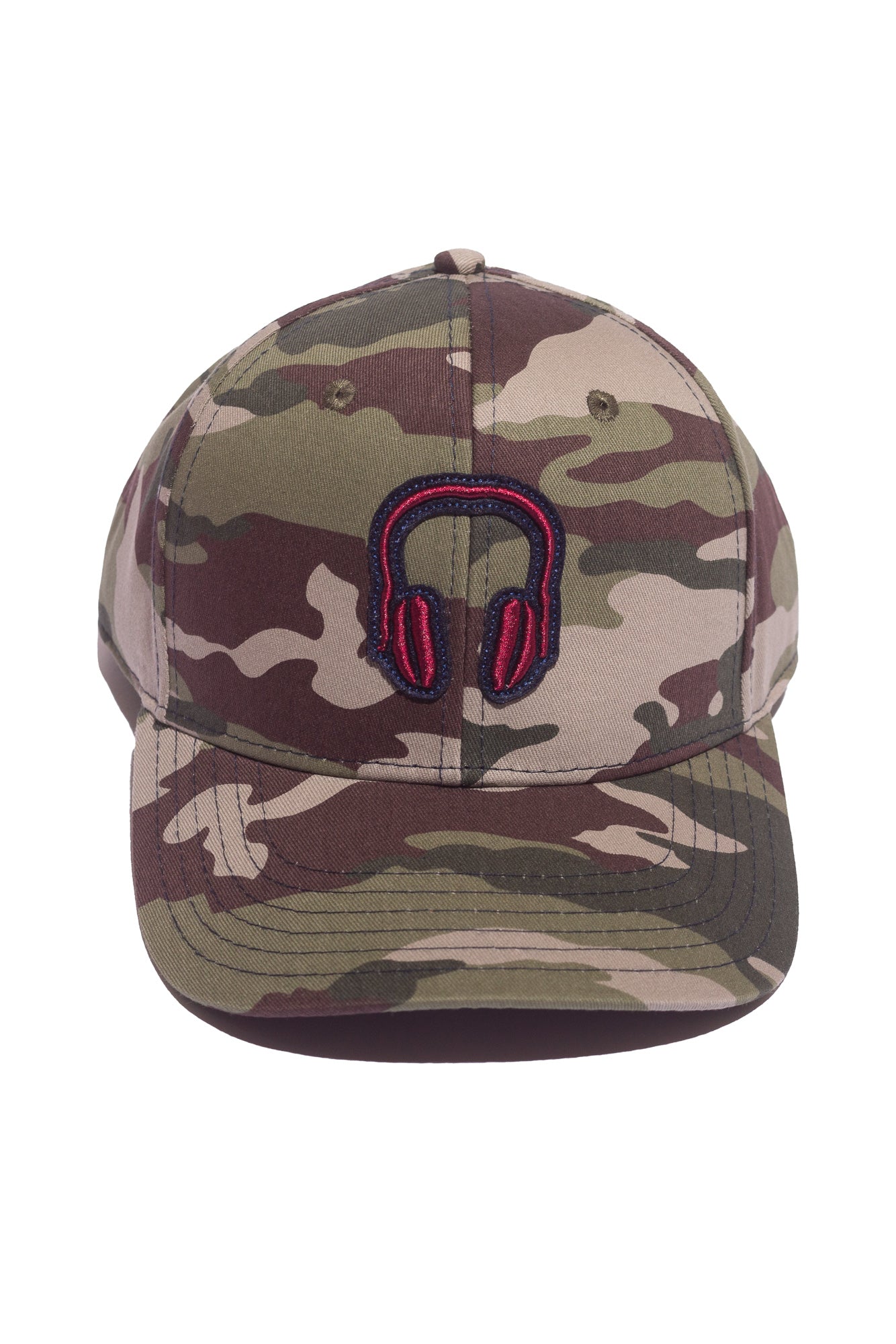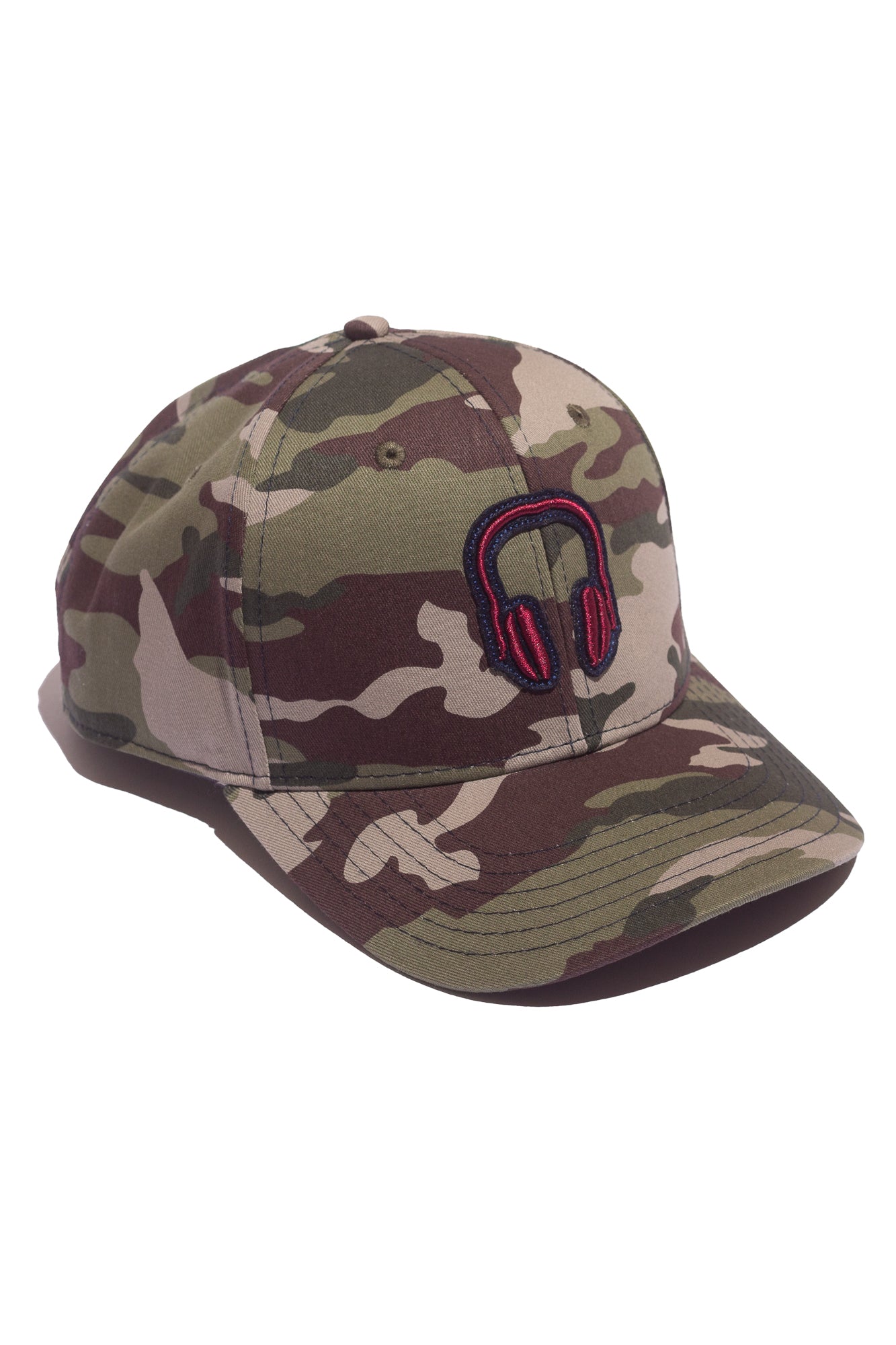 ARMY CAMO/NAVY TWILL SNAPBACK; CRIMSON HEADPHONES