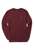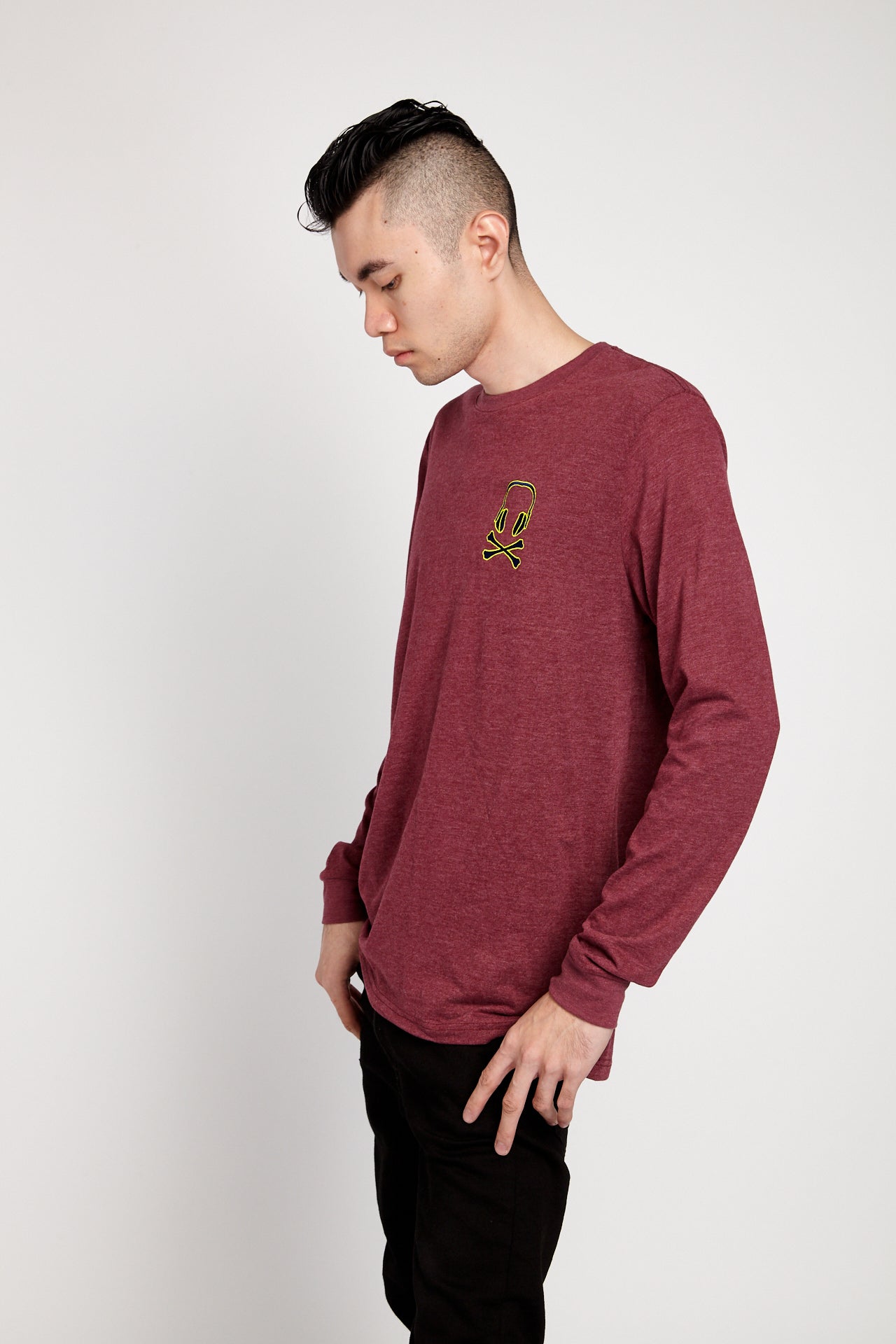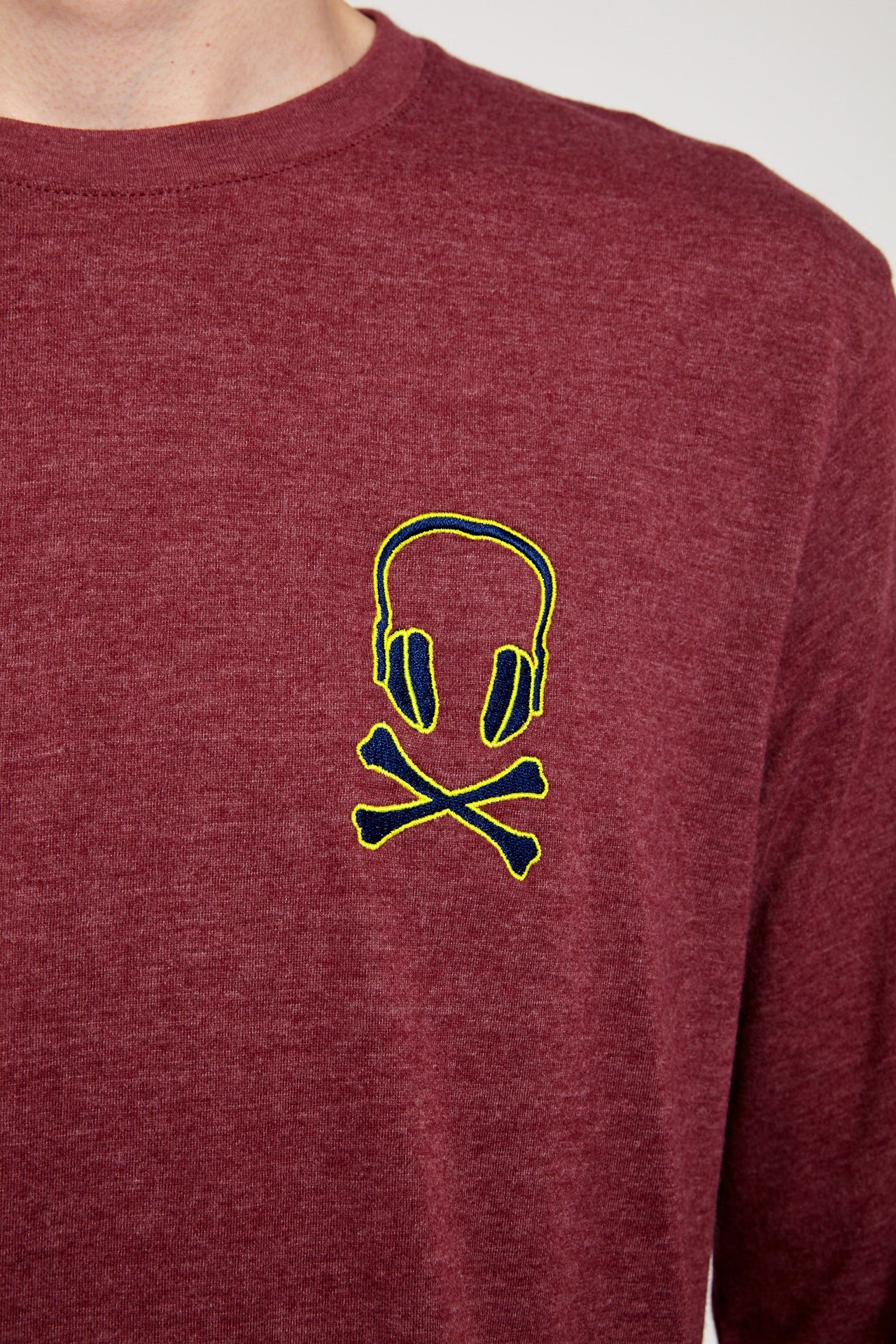 Two-color embroidered SOUNDOFF Badass Idol headphones on a super-comfortable sueded cotton, crew neck t-shirt perfect for seasonal layering or standalone casual street style. Heather Maroon.