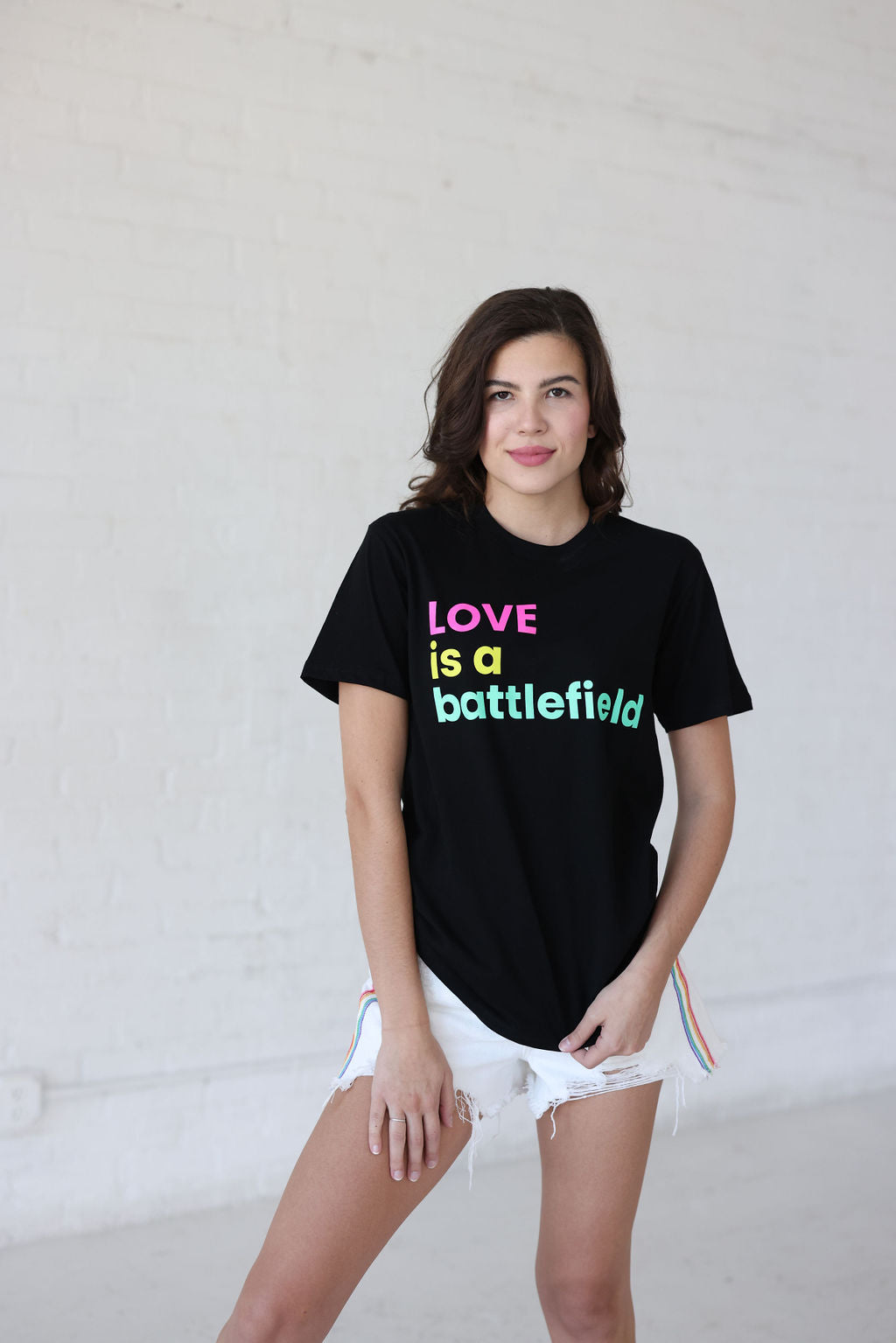 Sometimes Before You Can LOVE, You Have To Fight For The Right. Super-comfortable, premium t-shirt screenprinted with LOVE IS A BATTLEFIELD in 'nod to the 80's' neon colors.