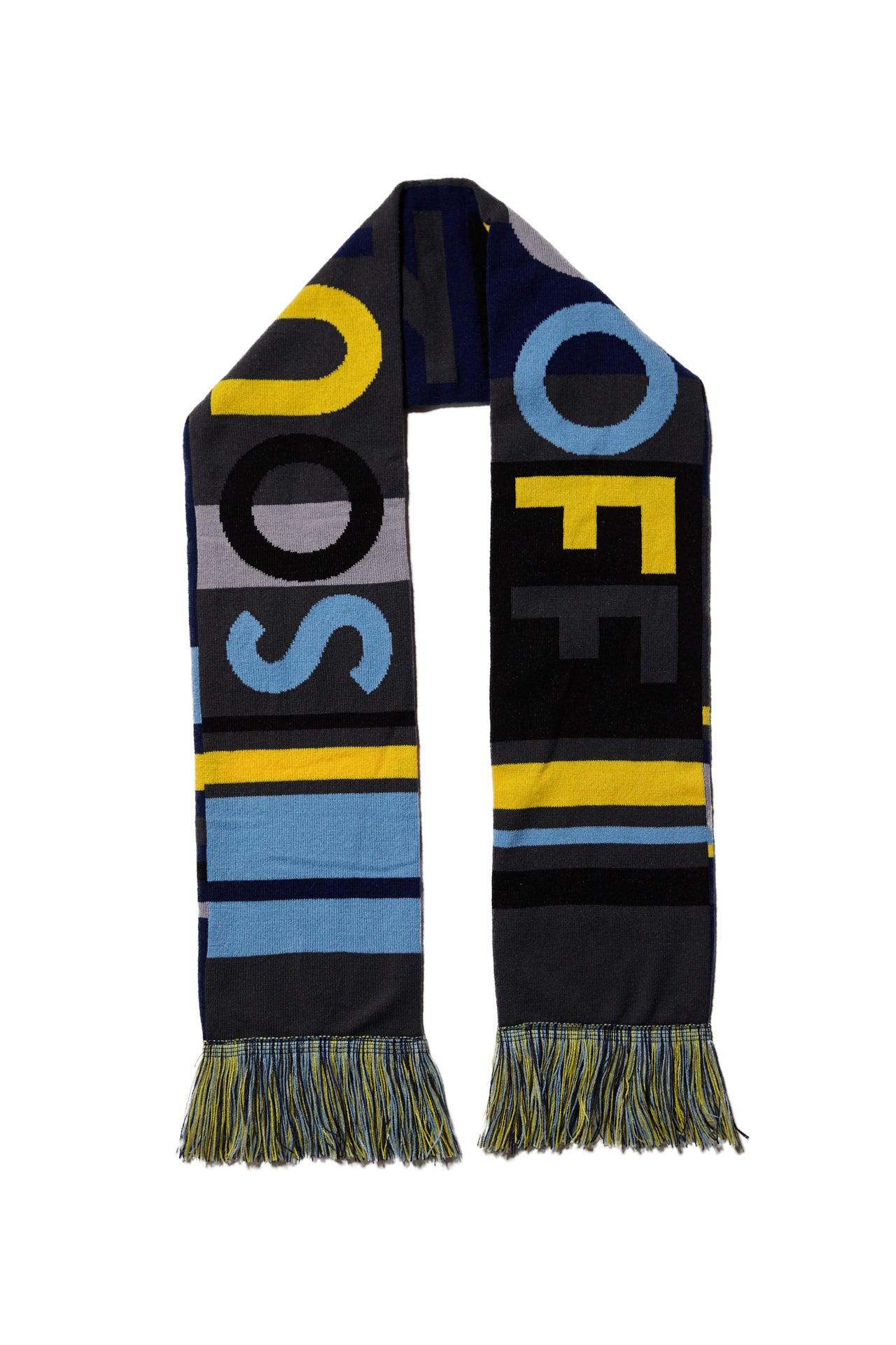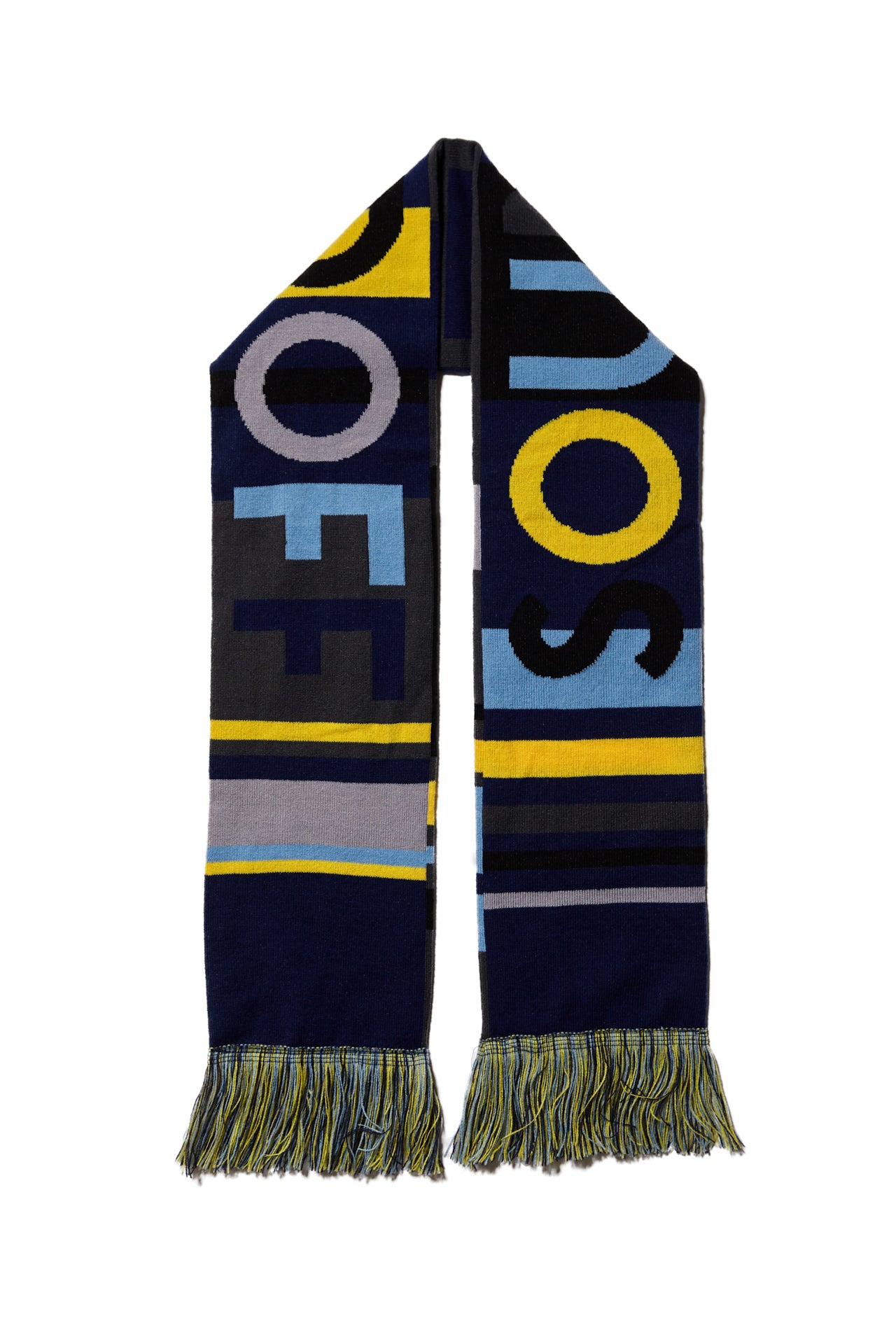 Custom woven color-block stadium scarf with fringe featuring SOUNDOFF on both sides